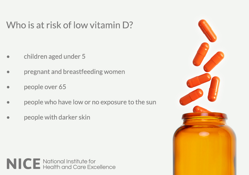 The main natural source of vitamin D is through the action of sunlight on the skin, but in the UK from mid-October to the start of April, sunlight doesn’t have the correct wavelength to create vitamin D in the skin. Many people are not aware that the sources of vitamin D available from food are limited. This means that people who are at risk of low vitamin D status may need dietary supplements.